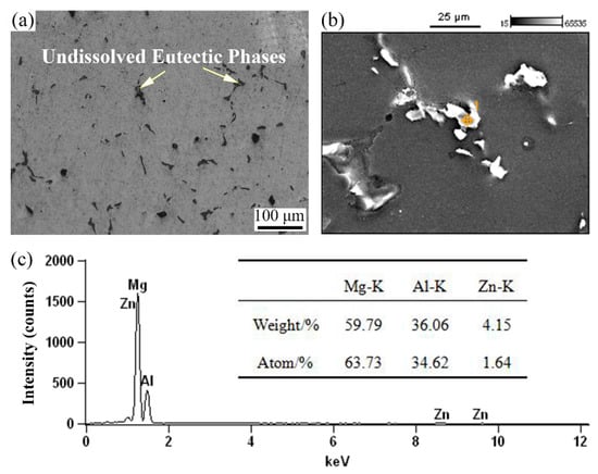 After solid solution treatment at 693 K for 25 h, most of the γ-precipitates and eutectic γ-phases were dissolved into the matrix, as shown in Figure 2a. However, there was still a small amount of γ-precipitates remaining, which were confirmed by the SEM and EDS results of Figure 2b,c.