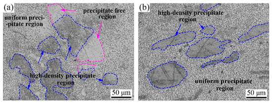 After 6p-ECAP, the grain size of the α-Mg was remarkably refined, but some coarse grains were still obvious, as shown in Figure 3a. Interestingly, heterogeneous precipitates were observed, which mainly comprised three regions, the uniform precipitates regions in fine grains, the precipitate-free regions, and the high-density precipitates regions in coarse grains. After short-time aging, the multimodal grain structure and heterogeneous precipitates were still maintained. However, the precipitate-free regions disappeared, and the density of the precipitates in the uniform precipitate regions increased slightly (Figure 3b). To further understand the microstructure evolutions, EBSD, SEM, and TEM observations were performed on both ECAP and aged alloys.
