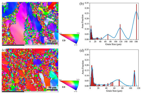 Figure 4 shows the EBSD inverse pole figure (IPF) maps and grain size statistic of the ECAP and ECAP-aged AZ91 alloys along the extruding direction. It was noteworthy that the ECAP alloy possessed a mixed grain structure composed of coarse grains and fine grains, representing a typical multimodal grain structure, as shown in Figure 4a. The fine grains (<20 μm) reached their peak at about 4 μm and had an average size of 5.82 μm. Meanwhile, the coarse grains exhibited an average grain size of 135.55 μm, and the volume fraction was about 63%. After short-time aging, the grain structure remained a multimodal distribution, but with a slight increase in the fine grains (5.96 μm) facilitated by thermal activation (Figure 4c). However, both the volume fraction (38.5%) and the average grain size (73.61 μm) of coarse grains decreased, indicating the refinement of the coarse grains occurred during aging. This was ascribed to the static recrystallization during aging, which will be discussed later.