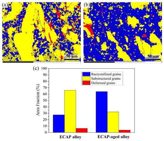 The mechanisms of the formation of the multimodal structure were further dissected. Figure 5 shows the distribution of the recrystallized, substructure, and deformed grains for the ECAP and ECAP-aged alloys. It was obvious that partial dynamic recrystallization occurred during ECAP (Figure 5a). In other words, the coarse deformed grains were replaced by a set of the new fine equiaxed grains gradually during ECAP. In fact, the coarse substructure grains in the ECAP alloy still possessed an area fraction of 65.94%, as shown in Figure 5c. Thus, a multimodal grain structure with fine recrystallized grains and coarse deformed grains was generated after 6p-ECAP. Moreover, after aging at 523 K for 5 h, the area fraction of the recrystallized grains increased from 27.59% to 64.03%, which was accompanied by the decrease in both the fraction and size of the substructure grains, as shown in Figure 5b,c. This indicated that an incompletely static recrystallization occurred during aging, which transformed the substructure grains to the new fine equiaxed grains. Due to the relatively short aging time, static recrystallization did not take place completely, and a certain amount of the coarse grains were retained. Therefore, the present low-pass ECAP and short time aging promoted the occurrence of incompletely thermodynamic recrystallization and finally caused the formation of the multimodal grain structure.