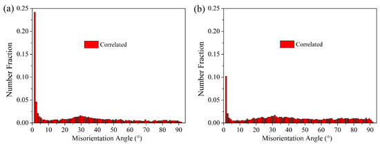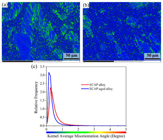Figure 6a,b shows the Kernel Average Misorientation (KAM) maps of the ECAP and ECAP-aged AZ91 alloys. KAM is usually used to represent average misorientation less than 5° between a given point and its nearest neighbors which belong to the same grain. Therefore, the KAM map can be used to assess local plastic strain and thus reflect, to some extent, the density of dislocations. It can be seen that the coarse grains, especially their nearby boundaries, possessed high KAM value both in the ECAP and ECAP-aged AZ91 alloys, indicating a high dislocation density in these regions. This provided further evidence that the coarse grains were the deformed or substructure grains. Previous research reported that the partial dynamic recrystallization of Mg and its alloys during thermal-mechanical deformation was conducted along the pre-existing coarse grain boundaries [22]. Hence, the coarse grains in the AZ91 ECAP alloy were the inner core areas of the large initial grains. Figure 6c shows the KAM value versus relative frequency. It is apparent that the relative frequency of low KAM values (less than 0.5°) was higher in the ECAP-aged alloy, while high KAM values were more pronounced in the ECAP alloy, suggesting that dislocation density in the ECAP-aged alloy was lower than that in the ECAP alloy. This demonstrated that the new fine grains nucleated along pre-existing coarse grain boundaries owing to their high dislocation density during aging, that is, occurrence of static recrystallization. Above all, the present result demonstrated that incomplete recrystallization along the pre-existing coarse grain boundaries was the fundamental reason for the formation of the multimodal grain structure.