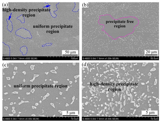 SEM micrographs of the AZ91 ECAP alloy. (a) the low-magnification SEM image showing high-density precipitate region and uniform precipitate region; (b) the SEM image showing precipitate free region; (c, d) the details of the marked regions in (a).