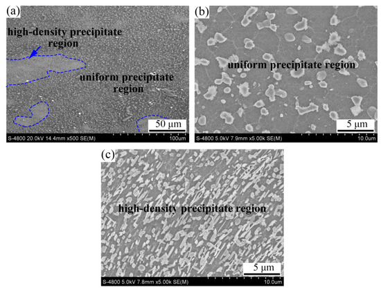 Figure 8 provides the SEM observations of the AZ91 ECAP-aged alloy. In stark contrast to the ECAP alloy, the ECAP-aged alloy was devoid of the precipitate-free regions (Figure 8a), indicating that the fine γ-phase preferentially formed in these coarse grains during aging. This can be ascribed to the high dislocation density of the coarse grains, as shown in Figure 6a. Moreover, the density of the precipitates both in high-density precipitate regions and uniform precipitate regions was slightly increased, while no obvious growth of the precipitates was found, as shown in Figure 8b,c. Therefore, precipitation mainly took place in the precipitate-free region, with continuous precipitation morphology during aging.