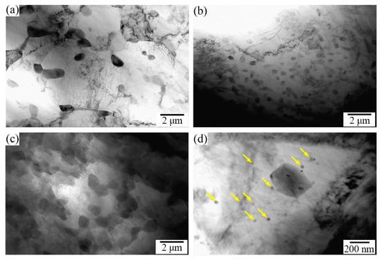 The TEM micrographs of the ECAP and ECAP-aged alloy are shown in Figure 9. It can be seen that the dispersed precipitates in the fine grain regions of the ECAP alloy were mainly located in the grain boundaries, while a few fine precipitates were found in the grain interior (Figure 9a). Figure 9b shows the precipitation morphology of the high-density precipitate regions of the ECAP alloy. These fine precipitates dispersed in a coarse grain, which further verified that the high-density precipitate regions mainly existed in the coarse grains. After aging, the density of the precipitates in the fine grain regions increased, as shown in Figure 9c. Figure 9d shows the enlargement of the precipitates within a coarse grain of the ECAP-aged alloy. Some spherical nanoscale precipitates (marked by yellow arrows) occurred in the coarse grain interior with a very low density. Therefore, these nanoscale precipitates slightly contributed to strengthening of alloy.