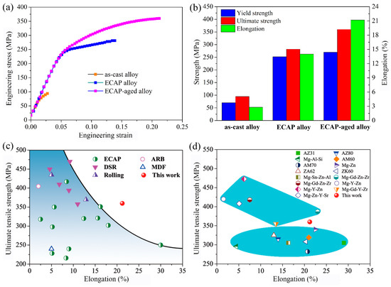 (a) Typical stress–strain curves of the AZ91 alloy; (b) The summary of yield strength, ultimate strength, and elongation to failure; (c) The ultimate tensile strength versus total tensile elongation of the AZ91 alloys in comparison with available literature data; (d) The ultimate tensile strength versus elongation of Mg-RE alloys and RE-free Mg alloys prepared by ECAP [37,38,39,40,41,42,43,44,45,46,47,48,49,50,51].