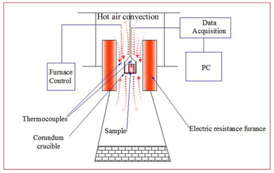 A sample of about 20 mm × 15 mm × 15 mm, chamfered in each arris, cut from ingots, is used to test the ignition temperature in air after polishing with 400, 800, 1000, 1500, and 3000 grades SiC papers, respectively, and was then degreased in acetone for 10 min. The experimental device for the ignition point test is shown in Figure 1, which exhibits characteristics of sample operations and air convection. And each time a sample is heated in a small furnace with a corundum crucible at a rate of 5 °C/min, the temperature of the sample is measured by a K-type thermocouple placed in a small hole drilled into the center of the sample. Moreover the interstice between the small hole and thermocouple is filled with refractory mortar to avoid flames being generating from there.