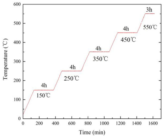 The sample mentioned above is dried at 70 °C for 2 h to investigate the multi-stage oxidation behavior by a tube type resistance furnace equipped with a high precision analytical balance named METTLER TOLEDD-XS (METTLER TOLEDD Inc., Shanghai, China), to record the weight change during the multi-stage oxidation in air. The multi-stage oxidation process shown in Figure 2 is as follows: room temperature 1 °C/min 150 °C 4 h 150 °C 1 °C/min 250 °C 4 h 250 °C 1 °C/min 350 °C 4 h 350 °C 1 °C/min 450 °C 4 h 450 °C 1 °C/min 550 °C 3 h 550 °C. In addition, using a NETZSCH STA449F3 (NETZSCH Inc., Selb, Germany) differential scanning calorimeter (DSC) apparatus to detect the fusing point of secondary phase of alloys, the heating rate of sample is 10 °C/min and sample is Φ 5 mm × 2 mm in size.