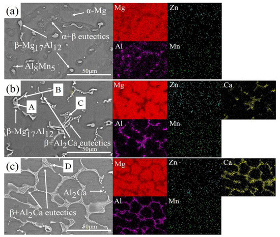 Figure 3 displays the microstructures of AZ80, AZX801, and AZX802 with the EDS mapping. Combined with XRD pattern of AZ80, as shown in Figure 4, α-Mg, divorced eutectic β-Mg17Al12, α-Mg + β-Mg17Al12 intermetallic, and few Al8Mn5 can be observed in Figure 3a, and the eutectic micro-constituent, consisting of α-Mg and β-Mg17Al12, mainly distribute along the dendrite boundaries of the α-Mg. In contrast to AZ80, the microstructures of AZX801, shown in Figure 3b, exhibit that α-Mg + β-Mg17Al12 lamellar eutectic is partially replaced by a chain-shaped phase considered as β-Mg17Al12 + Al2Ca eutectic micro-constituent, combined with the XRD pattern of AZX801, which is consistent with some researches [20,21,22,23,24]. The chain-shaped phase is fragmented after multi-stage oxidation, as given in Figure 5a,b. From the morphology of AZX802, as shown in Figure 3c, the network structure considered as β-Mg17Al12 + Al2Ca eutectic micro-constituent uniformly scatters in α-Mg matrix. The same phenomenon is observed in the microstructure of AZX802 after multi-stage oxidation, where the network structure is also fragmented and replaced by spherical and rod-like structures, as shown in Figure 5c,d. In addition, the dark spots in Figure 5a,c are burnt structures. Table 2 gives the EDS results taken from different positions as denoted in Figure 3 and Figure 5. The atomic ratios of Al/Ca are shown in Table 2, from which we can see that the atomic ratios of Al/Ca in the microstructure of as-cast are a little higher than that of microstructure after multi-stage oxidation, which verifies that chain-shaped phase and network structure are β-Mg17Al12 + Al2Ca eutectic micro-constituent. Furthermore, the fragmenting of the chain-shaped phase and network structure can also be explained by the dissolution of β-Mg17Al12 which is thermolabile and can easily dissolve into α-Mg matrix when exposed to homogenization treatment [25,26,27].