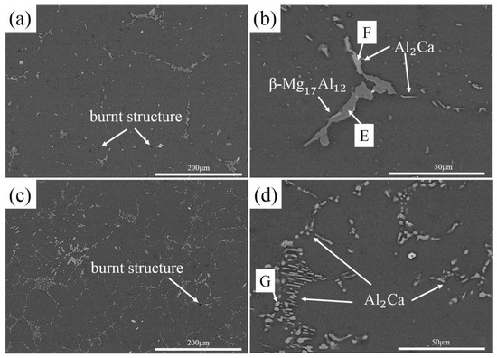 Microstructures of (a), (b) AZX801 and (c), (d) AZX802 alloys after multi-stage oxidation in air. The chain-shaped phase, new lamellar eutectic and network structure which are considered as β-Mg17Al12 + Al2Ca eutectic micro-constituent are fragmented after oxidation.