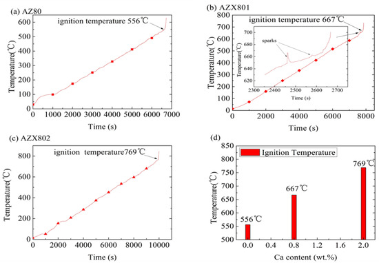 Figure 6 shows the ignition temperature test curves and ignition temperatures of all alloys. It is obvious that AZ80 shows the lowest ignition temperature 556 °C, compared with AZX801 (667 °C) and AZX802 (769 °C). This indicates that adding calcium can significantly improve the ignition temperature of magnesium alloys, which is attributable to the formation and increasing of Al2Ca in the matrix seen in Figure 3. The vapor pressure of Mg will increase in order of magnitude once magnesium alloys melt, thus causing Mg vapor to easily diffuse out the surface of the sample and rapidly react with oxygen in air [15,28,29,30]. So when the temperature is heated to 556 °C in Figure 6a, the alloy of AZ80 is semi-solid according to the phase diagram of Mg-Al, and magnesium vapor will permeate into the air and promptly react with oxygen, releasing an enormous amount of heat and cause AZ80 flaming. Figure 6b shows the small fluctuations of the ignition temperature test curve of AZX801 before burning, due to the small sparks generated during heating.