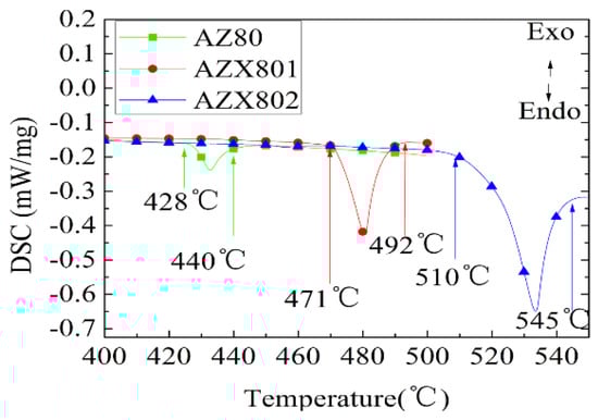 The oxidation of magnesium alloys at high temperature is always accompanied by a transformation of microstructure or even the partial melting of matrix alloys [30]. Figure 10 displays the differential scanning calorimeter (DSC) curves for AZ80, AZX801, and AZX802. The beginning point of the DSC valley means melting in the secondary phase [35]. Figure 10 shows the onset melting temperature of the secondary phase in AZ80 is 428 °C, approximating to 437 °C for the melting temperature of β-Mg17Al12. The onset melting of the secondary phase in AZX801 and AZX802 are 471 °C and 510 °C, respectively. Thus, the addition of Ca can remarkably increase the onset melting of the secondary phase in AZ80. In addition, the onset melting temperatures of the secondary phases in AZ80, AZX801, and AZX802, as presented in Figure 10, consist in the beginning of the accelerated oxidation temperatures shown in Figure 7. Furthermore, the melting in the second phase causes local high Mg vapor, and cracks are generated in the oxide at certain regions. Mg vapor can easily diffuse out of the substrate through the crack, making oxidation of the substrate continue at the oxide surface, which contributes to the growth of the oxide nodule. So the beginning of the accelerated oxidation in the weight gain curves indicates the onset melting of low melting temperature of eutectic micro-constituent accompanied by the growth of the oxide nodule as described above. A hypothesis for the evolution of the alloy oxidation is schematically depicted in Figure 11.