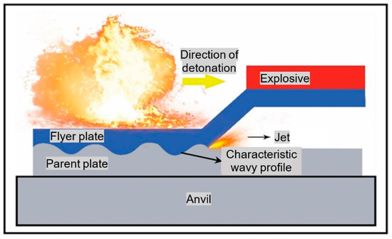 where Vp is the flyer plate velocity (m/s), Vd is the explosive velocity (Elbar-5 = 3200 m/s) and α is the arrangement angle (parallel arrangement = 0°). Table 2 gives the welding parameters used in the experiments.