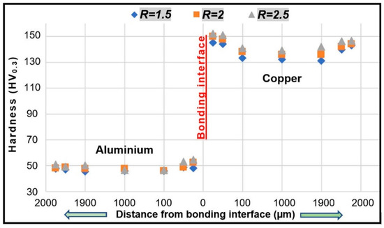 When the increased hardness values (Figure 6) are examined, greater increases in hardness can be seen near the bonding interface than on the outer surfaces of the plates. In explosive welding, the explosive ratio determines the collision velocity and hence the amount of deformation. The increasing amount of deformation affected the hardness value on the outer surfaces of the materials and near the bonding interface. For example, the hardness value of the original copper plate was ~130 HV, and at the ratio of R = 1.5, the value was 145 HV at the closest distance to the bonding interface of 25 μm, while it was 144 HV at a distance of 50 μm. The hardness values at 100, 1000 (plate thickness centre) and 1900 μm were found to be 132, 133, 131 HV, respectively. When approaching the outer surface of the plate from the bonding interface, the value of 140 HV was found and at a distance of 1950 μm (the outermost surface of the plate), a hardness value of 143 HV was detected. Similar hardness values were determined at the same distances for the R = 2 and R = 2.5 explosive ratios. On the other (aluminium) side of the composite material, moving away from the bonding interface, the hardness values decreased. In the central thickness area of the plate, the original aluminium hardness value (~46 HV) was nearly reached and moving toward the outer surface of the plate, the hardness values again increased.