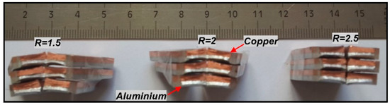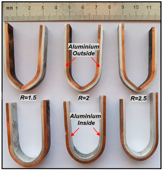 Macro images of the copper-aluminium composite samples after application of bidirectional (aluminium inner and outer) bending tests are given in Figure 9.
