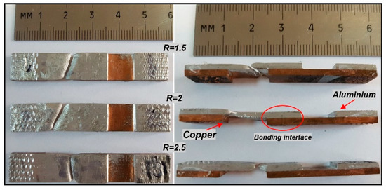 Macro images of copper-aluminium samples after the tensile-shear test.