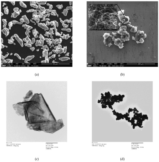 The Al powder was supplied by Alfa Aesar with a purity of 99.8 wt. % and with 0.1 wt. % Fe as the major impurity. The chemical composition was determined by a PANalytical X-ray Fluorescence spectrometer (PANalytical AXIOSmax, PANalytical B.V., Almelo, The Netherlands). This powder has a density of 2670 kg/m3, measured by a Helium pycnometer (micromeritics AccuPyc 1330, Micromeritics Instrument Corporation, Norcross, GA, USA). The Al powder characteristics such as powder morphology and particle size distribution (PSD) are presented in Figure 1a and Table 1, analyzed by SEM (FEI-Quanta 400 FEG equipment, FEI Company, Hillsboro, OR, USA), and a Malvern Laser scattering diffraction instrument (Mastersizer 3000, Malvern Instruments Limited, Worcestershire, UK), respectively. Pristine MWCNT was supplied by FIBERMAX composites, which are in large agglomerates (Figure 1b) and have an average external diameter of 23 ± 7 nm (measured by ImageJ, 1.51r, Wayne Rasband, National Institutes of Health, Bethesda, MD, USA). These nanotubes have a density of 2013 kg/m3. Graphene nanosheets (multilayer flakes with 98.5% purity) were supplied by Graphene Supermarket (Figure 1c), the WC (99.8% purity) by H.C. Starck Tungsten GmbH (Table 1 and Figure 1d), and the nanoalumina by Sigma Aldrich (Table 1). The TEM (FEI TECNAI G2 20 S-TWIN, FEI Company, Hillsboro, OR, USA) was used to observe the nanoreinforcements.