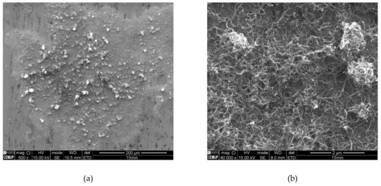 Since the MWCNT agglomerations affect the matrix strengthening [31], the ultrasonication technique was applied to facilitate the MWCNT separation. An isopropanol-MWCNT mixture with a very small concentration (~1.5 × 10−4 g/mL) of MWCNT was placed in the ultrasonication bath for 60 min, and specimens were taken for microscopy observations after 0, 15, and 60 min of dispersion. The analysis of Figure 1b and Figure 3a–d shows that the longer the ultrasonication time, the smaller the agglomerates. Microscopy observations also highlighted the fact that the MWCNTs, after being processed for 60 min, were not exfoliated even when they were processed by the high speed sonication for 15 min (Figure 3e).
