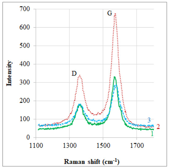 Raman spectra taken, first order region, from pristine MWCNT (No. 1 in green), assisted sonication MWCNT (No. 2 in red), and assisted sonication Al-1 vol. % MWCNT (No. 3 in blue).
