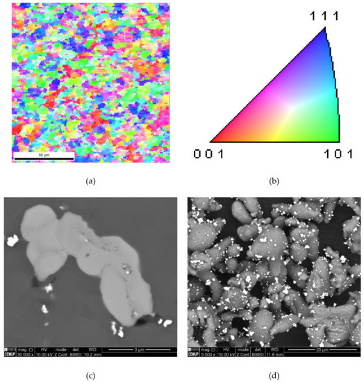(a) and (b) SEM/EBSD analysis illustrating the IPF and coded map of the Al matrix; (c) SEM/BSE images illustrating the WC and the phase formed after sintering; and (d) distribution of WC in Al powder.