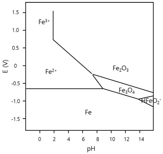 E-pH diagram of Fe in water at 25 °C, assuming [Fe2+] = 10−6.
