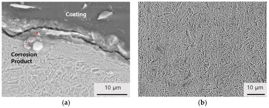 Figure 2 shows the SEM images of the specimens. Lath martensite, which is usually found in spring steels with a carbon content of less than 0.6 wt% [], is observed for both S and M group samples. Some distortion of grains due to the pressure involved by shot peening is seen from the surface to a depth of about 10–20 μm. Cracks were found in the corrosion product layer between the alloy and the coating. During the proving ground test, the paint coating was degraded and water penetrated into the coating–metal interface. Corrosion products formed on the metal below the coating and caused the detachment of the coating layer. Wet–dry cycles, temperature variation, and impingement of sand or fine gravel led to the cracking of the coating and corrosion products.