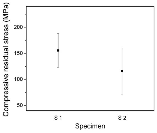 The residual stress of S group specimens was measured by IIT and is shown in Figure 3. The compressive stress of the two specimens, S1 and S2, are 155 and 116 MPa on average, respectively.