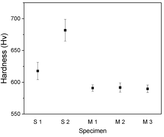 Figure 4 shows the hardness of the S and M specimens. The hardness of the S1 and S2 samples was Hv 617 and Hv 682, respectively. The hardness of the M specimens was approximately Hv 590. The hardness of the alloy surface was increased due to the increase of the dislocation density by compressive stress during shot peening []. The deviation between the data for the M specimens was much lower than that for the S specimens. The variations in the residual stress and hardness were large between the S specimens and also between the repetitive measurements for a given S specimen. The different depth of grinding between the S1 and S2 specimens caused a different compressive stress and hardness because the compressive stress had a gradual increase and decrease profile with depth. The deviation of data for a specimen was presumed to be due to the shot peening, which created locally irregular stress on the surface from the random overlapping of impingements.