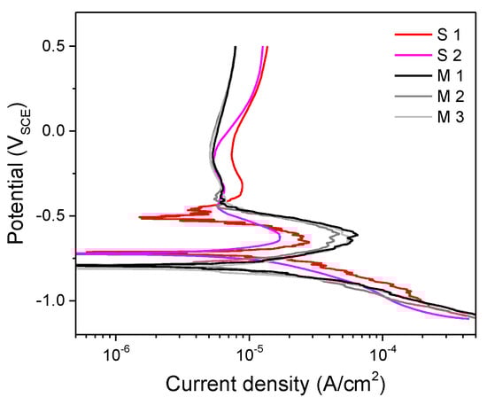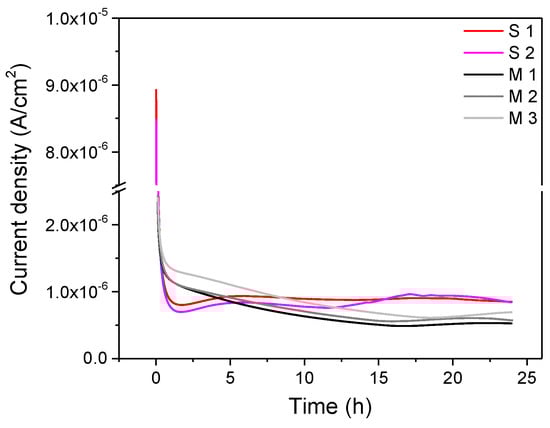 The passive current density reached 8.4 × 10−7–8.5 × 10−7 A/cm2 for the S specimens and 5.3 × 10−7–6.9 × 10−7 A/cm2 for the M specimens after 24 h of passivation (Figure 8). The S specimens had a higher current density than that of the M specimens, although the ranking of the passive current density of each specimen shown in the potentiostatic polarization (Figure 8) was different from that shown by the ipass at 0.5 VSCE from the potentiodynamic polarization (Figure 6).