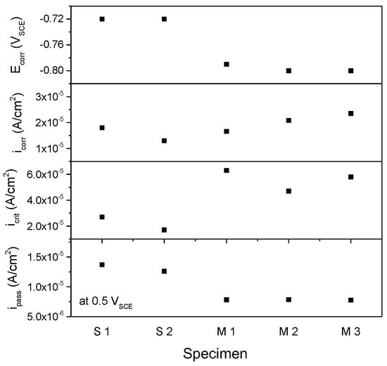 The corrosion potential (Ecorr), the corrosion rate (icorr), and the passive current density (ipass) at 0.5 VSCE are plotted in Figure 6. The corrosion potential and the passive current density at 0.5 VSCE of the S group were a little higher than those of the M group. The corrosion rate did not appear to show a dependence on the specimens. The critical anodic current density was measured to be 1.6 × 10−5–2.6 × 10−5 A/cm2 for the S group and 4.6 × 10−5–6.4 × 10−5 A/cm2 for the M group at −0.65–−0.60 VSCE, indicating that the maximum dissolution rate of the S group was lower than that of the M group. It is remarkable that the S specimens, which have residual stress, dissolved less before passivation but that the passive current density of the S specimens was higher than the M specimens without residual stress.