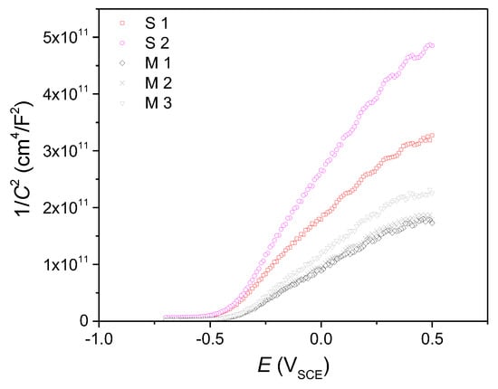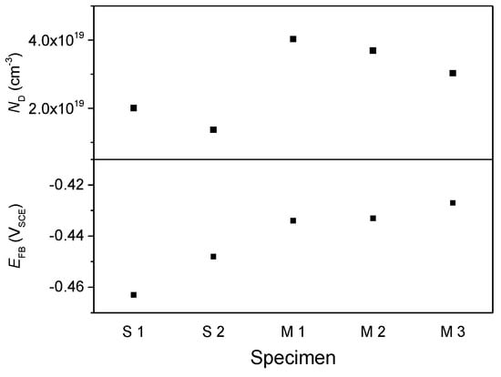 The donor density and the flat band potential of the passive films formed on the S and M specimens are shown in Figure 10. The donor density of the S1 and S2 specimens was measured to be 2.01 × 1019 cm−3 and 1.37 × 1019 cm−3, respectively, whereas that of the M specimens was 3.03 × 1019–4.03 × 1019 cm−3. The density of point defect, which is thought commonly to be oxygen vacancy for the n-type passive film [], was found to be higher in the passive film of the steels without residual stress than in the film on the specimens with stress. The flat band potential of passive films on the M specimens was −0.427–−0.434 VSCE and a little higher than that (−0.448–0.463 VSCE) of the film on the S specimens.