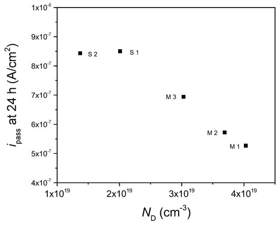 Figure 11 shows the ipass at 24 h vs. the ND plot, based on the data presented in Figure 8 and Figure 10. The passive current density decreased with an increase in the defect density in the passive film generally, although such dependence was not explicit for S2. The authors could anticipate easily that a low density of point defects leads to a slow mass transport and hence a low passive current density. However, the results of this study presented the opposite, in that the passive current density for the M specimens was lower than that for the S specimens although the donor density of the M specimens was higher.