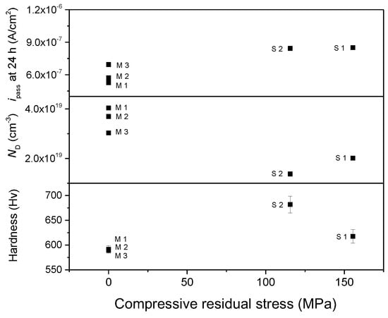 Figure 12 shows the ipass at 24 h, the ND, and the hardness vs. the residual stress plots. The hardness of the S specimens was higher than that of the M specimens, but not increased with an increase in the residual stress. The passive current density was generally higher for the specimens with stress but did not appear to depend on the residual stress in the S group. The donor density was lower for the S specimens, but it had rather increased with an increase in the compressive stress in the S group. It is not clear whether the compressive residual stress involves any relationship which can be described as a linear or a high-order function from this work. However, it was noted that the bulk specimen without residual stress (i.e., the M group) and the sub-surface specimen with residual stress (i.e., the S group) had a different corrosion and passivity behavior.