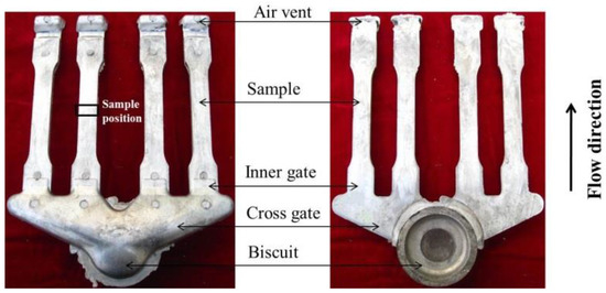 The composition of the AZ31 alloy used was: Al 3%, Mn 0.6%, Zn 1%, Cu 0.05%, Si 0.1%, Mg balance (Ningxia Huayuan MagnesiumIndustry Group Co., Ltd., Ningxia, China). The RDC experiment included semisolid slurry preparation and die-casting. The slurry was prepared with a self-inoculation method, which involves adding certain fraction of solid blocks of AZ31 and pouring the alloy melt through a multi-stream cooling channel. Details of this process are shown in the literature [9,10]. In this work, 1.5 kg of alloy ingots was melted in a resistance furnace. After preparation, the slurry was transferred to a cold chamber high-pressure die-casting machine (DAK450-54RC, FRECH Die Casting Machine Co., Ltd. Shanghai, China) and die-cast at different injection velocities from 0.5–9 m/s. It should be emphasized that this velocity range was selected as a value that can ensure the complete filling of the slurry, and so the lowest velocity of 0.5 m/s was employed. A mold temperature controller (ROBAMAT 5212, FRECH Die Casting Machine Co., Ltd., Shanghai, China) was used to control the mold temperature at 250 °C, and the boost pressure of the die casting machine was set steadily at 160 MPa. Slurries with a solid fraction of 0.42 and 0.61 were employed for the RDC experiments.
