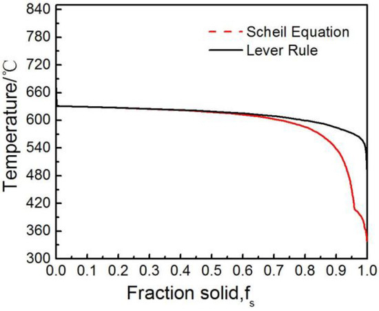 In order to develop an essential thermodynamic guide for semisolid processing, thermodynamic simulation of the phase diagram of AZ31 alloy was first carried out by using the pandat software package (version 7.0, Compu Therm LLC, Middleton, WI, USA). This calculation was based on the composition of the AZ31 alloy shown in Section 2. Figure 2 shows the temperature versus solid fraction curves obtained using the lever rule and the Scheil equation. It can be found that the solidification temperature range of this alloy (from liquidus to solidus) is 180.32 °C (673.17−492.85 °C) for the lever rule model, and the 335.03 °C (673.17−338.13 °C) for the Scheil equation model. The precipitation temperature of the primary α-Mg phase has only a tiny difference between the two models, which is 630.82 °C for the lever rule and 630.72 °C for the Scheil model. However, the changing trend of temperature with the solid fraction in these two models becomes more and more diverged along with the solidification. The obvious discrepancy is that in the Scheil equation, the eutectic reaction appears, but in the lever rule model, the eutectic reaction does not appear. Considering that the alloy experiences non-equilibrium solidification in actual rheo-diecasting, the calculation result based on the Scheil model was adopted. Referring to this result, the slurry temperature was set steadily and exactly at 620 °C and 610 °C in the RDC experiment, and the corresponding solid fraction was 0.42 and 0.61 respectively.