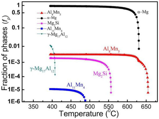 Figure 3 shows the precipitation sequence and the molar fractions of all solidified phases during the non-equilibrium solidification of AZ31. The main elements such as Mg, Al, Mn, and Si were used for the thermodynamic simulation, while the other elements were omitted due to their negligibility. It can be found that the hard Al8Mn5 phase was initially formed along with melt cooling, then α-Mg (HCP), Mg2Si, and Al11Mn4 were formed in order with the decrease of temperature. The γ-Mg17Al12 phase finally formed from an eutectic reaction, indicating the finishing of solidification.