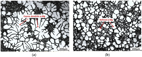 In order to investigate the semisolid microstructure feature of AZ31, the microstructure of the samples quenched at 610 °C in different solidification conditions were examined. As shown in Figure 4a, the sample microstructure from conventional solidification presented a coarse dendritic structure, and the average size of the primary α-Mg was up to 413 µm. In Figure 4b, the melt was internal chilled with alloy blocks and then poured through a multi-stream cooling channel. The microstructure consisted of fine and spherical α-Mg particles, and its average size was reduced to 76 µm. This semisolid microstructure feature, similar to cast Mg alloy of high Al content such as AZ91 and AM60 [11,12], commendably meets the requirements of semisolid forming. The authors’ previous work provides detailed information of the slurry-making process [9,10].
