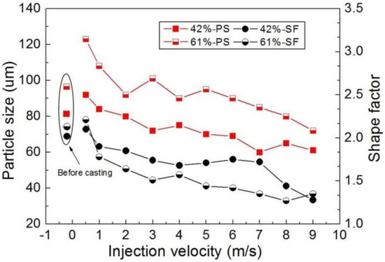 Figure 6 shows the effect of injection velocity on the particle size and shape factor of the primary α-Mg particles. The size and shape factor of the primary α-Mg in slurry before die-casting has also been analyzed by observing the microstructure of the quenched sample. It can be found that the die-casting process had a promoting effect on the reduction of the particle size and shape factor, especially at a high injection velocity. Furthermore, the particle size in these two solid fraction conditions all decreased with the increase of injection velocity, and the shape factor decreased as well. It was also found that the primary α-Mg particles at the solid fraction of 0.61 were larger and rounder than the solid fraction of 0.42. This means that the growth and the coarsening of primary α-Mg were prolonged with the cooling of slurry from 620 °C to 610 °C. From these results, it is reasonable to conclude that the high injection velocity is beneficial to the grain refinement and the spheroidization of the primary phase in RDC.