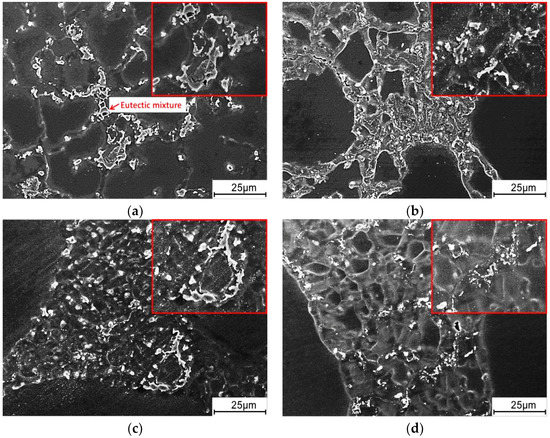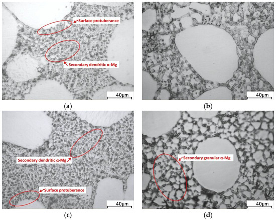 Figure 7 shows the microstructures of the matrix between primary α-Mg particles. This microstructure was formed from the solidification of remaining liquid in the die cavity (which also can be termed as secondary solidification [18]). At the solid fraction of 0.42 and the velocity of 0.5 m/s, Figure 7a, the ramiform protuberances attached on the primary α-Mg surface and many dendrites existed in the matrix. This indicates that the remaining liquid was nucleated both on the surface of primary phase and within the liquid matrix. As the velocity was increased to 3 m/s, Figure 7b, the protuberances on the primary α-Mg reduced and the dendritic α-Mg evolved into coarse granular particles. This implies that with the increase of velocity, the nucleation occurred mostly within a liquid matrix, and the secondary solidification microstructure was refined. The same results can be found in samples with 61% solid fraction when comparing Figure 7c,d. A distinction is that the secondary α-Mg in Figure 7d were more fine and uniform compared with Figure 7b, which indicates a more remarkable refining effect of high velocity on the secondary solidification microstructure at a high solid fraction.