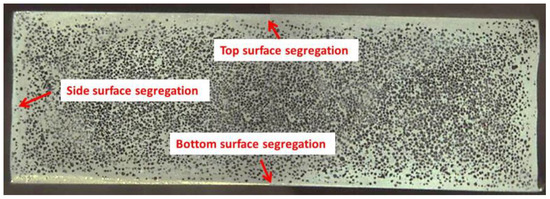 The distribution of the primary phase, namely the macrostructural uniformity, is also an important factor effecting the final property of the castings [21,22]. Therefore, the distributions of primary α-Mg in the cross-sections of the samples have also been investigated. Figure 9 shows the distribution of the primary α-Mg in entire cross-section of the sample, with a solid fraction of 0.61 and an injection velocity of 1 m/s. It is obvious that a solid segregation layer appeared on the sample surface, and this was nearly symmetrical in the channel. In the experiment, we found that this segregation within the same sheet sample was nearly changeless along the flow direction.