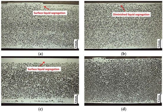 Figure 10 show the effect of the solid fraction and the injection velocity on this surface segregation. In Figure 10a, under a solid fraction of 0.42 and an injection velocity of 0.5 m/s, the α-Mg fraction gradually decreased from the center to the sample surface; thus a surface liquid layer with a width of approximately 0.3 mm formed. At the same velocity, when the solid fraction was increased to 0.61 (Figure 10c), a more serious α-Mg segregation along the sample thickness formed, and the width of the segregation layer was approximately 0.8 mm. However, when the injection velocity was increased to 3 m/s (Figure 10b), the distribution of primary α-Mg along the sample thickness became more uniform, and the surface liquid segregation was reduced readily. This is particularly evident in samples with the solid fraction of 0.61, as shown in Figure 10d.