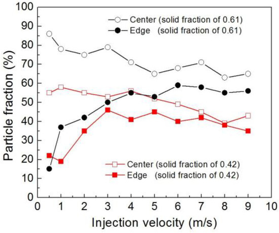 Figure 11 shows the variation of the primary α-Mg fraction in an area of 1 mm × 1 mm (in the center and the edge of the sample) at different injection velocities. The quantitative results revealed that at a solid fraction of 0.42, the α-Mg fraction in the sample center decreased with the increase of velocity, while the edge increased with velocity. When the velocity was larger than 3 m/s, the variation of the α-Mg fraction at the center and at the edge reached balance, and the α-Mg fraction in these two areas became equivalent. Similar results appeared at a solid fraction of 0.61. It is therefore clear that the surface liquid segregation closely relates to the injection velocity and the solid fraction, and a higher velocity is beneficial to ensuring the uniform distribution of primary phase, especially in the slurry with high solid fraction. This phenomenon is in good agreement with the results reported by Khosravani et al. and Mir et al., which refer to the microstructure of the thix-formed AZ91 and A356 alloys [23,24].