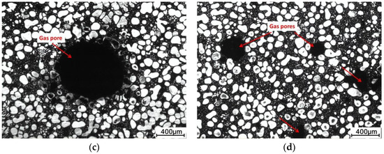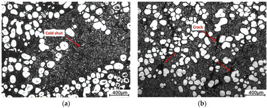 Figure 12 shows the typical casting defects formed under different injection velocities. Figure 11a shows the internal liquid segregation occasionally observed in samples with a solid fraction of 0.42, at 0.5 m/s and 1 m/s. Different from surface liquid segregation, this defect, also called a cold shut, was formed due to liquid solidification on chamber wall or plunger surface during filling. The lower injection velocity means a longer contact time between the slurry and the chamber wall; thus, more liquid solidified in the chamber wall, and then the solidified alloy was drawn into slurry and formed the cold shut. Figure 12b shows the cracks frequently observed in the sample with a solid fraction of 0.42 when the injection was higher than 3 mm/s. Shrinkage was the main source for this crack, and this mainly resulted from insufficient solidification feeding [26]. In the later period of solidification, these cracks initiated from shrinkage and extended along the liquid matrix under shrinkage stress. Increased injection velocity means an improved solidification rate and reduced feeding time, so it was able to induce shrinkage from these cracks. Figure 12c,d show the two typical examples of the gas porosity formed at a solid fraction of 0.42 and an injection velocity of 3 m/s and 7 m/s. It was found that the size of the gas porosity decreased with the increase of velocity, but the distribution turned to be much denser. At a low velocity, the flow front presents as laminar, but some instability still exists at the semi-solid/gas interface [27], which is able to capture gas in the melt flow and form larger pores. When the injection velocity was high, the flow turned from laminar to turbulent; thus, more gas in the die cavity could be inhaled in the slurry and generate small porosities. In this work, the gas porosity was significantly eliminated at a lower injection velocity of 0.5 m/s and 1 m/s for samples with a solid fraction of 0.42 and 0.61 respectively.