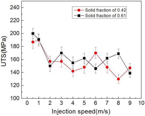 Figure 13 shows the variation of sample tensile strength under different injection velocities. The best value of 201 MPa and 192 MPa was obtained at 0.5 and 1 m/s for samples with solid fractions of 0.61 and 0.42 respectively. Meanwhile, the strength decreased sharply along with the increase of velocity, from 1 m/s to 2 m/s. Further increases of velocity from 2 m/s to 7 m/s led to a fluctuation of the strength value, and the lowest values of 139 and 130 MPa appeared at 9 m/s and 8 m/s for the solid fractions of 0.61 and 0.42, respectively. Different from microstructure refining, this result showed an adverse effect of the injection velocity on the sample tensile strength.