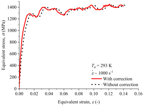 During dynamic experiments, a part of the plastic work is converted into heat and cannot be dissipated along the specimen, contrary to quasi-static loading. In the last case, the temperature is therefore assumed as constant and equal to the initial temperature imposed to the specimen. In dynamic conditions corresponding to adiabatic conditions, the temperature increases ΔT during the process of plastic deformation is defined in Equation (4) as
