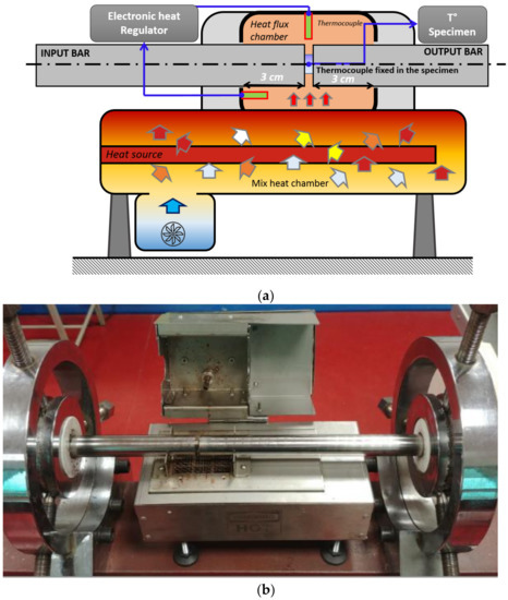 In addition, and as discussed previously, thermal softening appears at high strain rates for deformations larger than 0.1. Therefore, an experimental study was carried out to determine the temperature sensitivity of the studied HSS material. Experiments at high temperatures for a strain rate equal to 0.001 s−1 have been performed using a climatic chamber surrounding the sample and the compression platens. These platens were heated to an imposed temperature, and the specimen was then placed and heated during 30 min before the test. This procedure was used to avoid cooling the specimen by thermal conduction with the compression tools. The tests were performed with a constant strain rate controlled by an extensometer fixed on the compression platens. Each test was performed three times to ensure the repeatability of the experiments. High temperature experiments under dynamic conditions were carried out using a specific furnace heating the specimen and the bar ends. This furnace is similar to the one used by Rusinek et al. [21]. A description of this apparatus is given in Figure 2. If a hot specimen is placed in contact with the bars at room temperature, the thermal conduction induces a fast cooling of the specimen as described in [18]. To avoid this problem, the ends of the bars were heated in the furnace. All parts were heated for 30 min to reach a homogeneous temperature distribution within the specimen.
