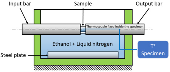Experiments at low temperature were also carried out in the dynamic regime, using liquid nitrogen mixed with ethanol to adjust the temperature. Ethanol was chosen because of its melting temperature close to 159 K. The bars were in contact with the mixture to decrease their temperature, as described in Figure 3. This study assumes that the evolution of the elastic properties is negligible for these temperatures [22]. Moreover, no bending of the bars was observed during the test. The specimen was not in contact with the mixture, but was cooled by conduction. An instrumented specimen with a thermocouple was used to determine the temperature and the waiting time required before dynamic compression testing. The temperature was set by adding either liquid nitrogen or ethanol. Moreover, a thick steel plate was placed at the bottom of the cooling box to increase the thermal inertia of the mixture.