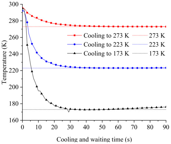 Once the temperature is stabilized, the instrumented specimen was removed and a sample was placed between the bars. The temperature recorded inside the instrumented specimen is shown in Figure 4. A stable temperature is reached by conduction after a cooling time between 30 and 40 s once the specimen is placed between the bars. Moreover, as the bars are cooled prior to the test, their thermal inertia allows one to maintain the temperature of the specimen for a duration long enough to perform the test. For example, for a target temperature of 173 K, the specimen is maintained between 172 K and 174 K for 35 s (from 30–65 s). For a target temperature of 273 K and 223 K, the temperature of the specimen is maintained (at ±1 K) for more than a minute.