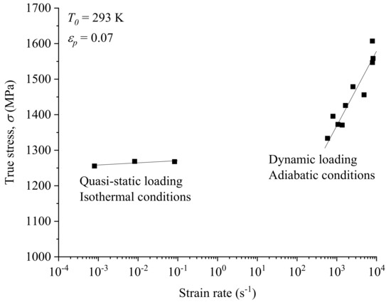 The true stress values for each strain rate for a given strain level are represented in Figure 5. A plastic strain value below 0.1 was chosen to reduce the adiabatic heating effect on the stress. Therefore, the thermal softening effect is assumed to be negligible for this strain level. These experiments highlight a stress increase with the strain rate. Moreover, it has to be noticed that the strain rate sensitivity is much higher under dynamic conditions in comparison with low strain rates. The strain rate sensitivity, defined by , is equal to 0.0021 for quasi-static loading and reaches 0.058 for dynamic loading. Thus, a nonlinear strain rate sensitivity is observed for the studied material and in general for metals [23,24,25].