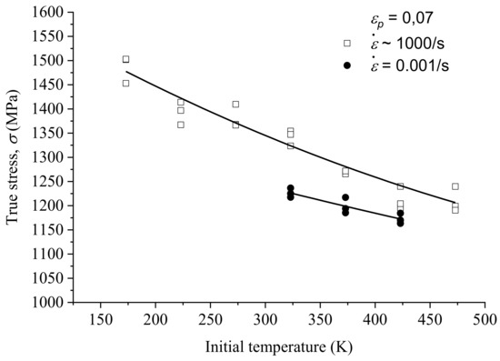 The true stress values for each temperature and an imposed plastic strain level are reported in Figure 6. It has to be noted that the considered temperatures are corresponding to the initial temperatures (at the beginning of the test). The stress decreases as the temperature increases. The temperature sensitivity, defined by , is equal to −0.21 in dynamic loading conditions and decrease to −0.17 in quasi-static conditions.