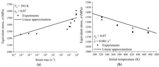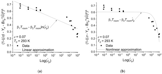 In order to determine and , the term versus is plotted for a fixed temperature. The results are reported in Figure 10a. The linear approximation is supposed to be equal to with Troom assumed as equal to 293 K. Nevertheless, the experimental data do not exhibit a linear behavior, especially under dynamic loading conditions. Therefore, all the domains defined in terms of strain rate may not be correctly modeled, as shown in Figure 10a. To obtain a better correlation with experimental observations a nonlinear approach is proposed, allowing one to model the non-linearity of the stress at high strain rates and to increase the strain rate sensitivity, as shown in Figure 10b. The thermal part, is defined in this case using Equation (9) as